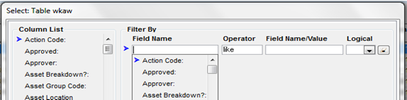 Status | in | ('AWA','AWS','DO') | Displays all records where WO status is AWA, AWS, or DO |
